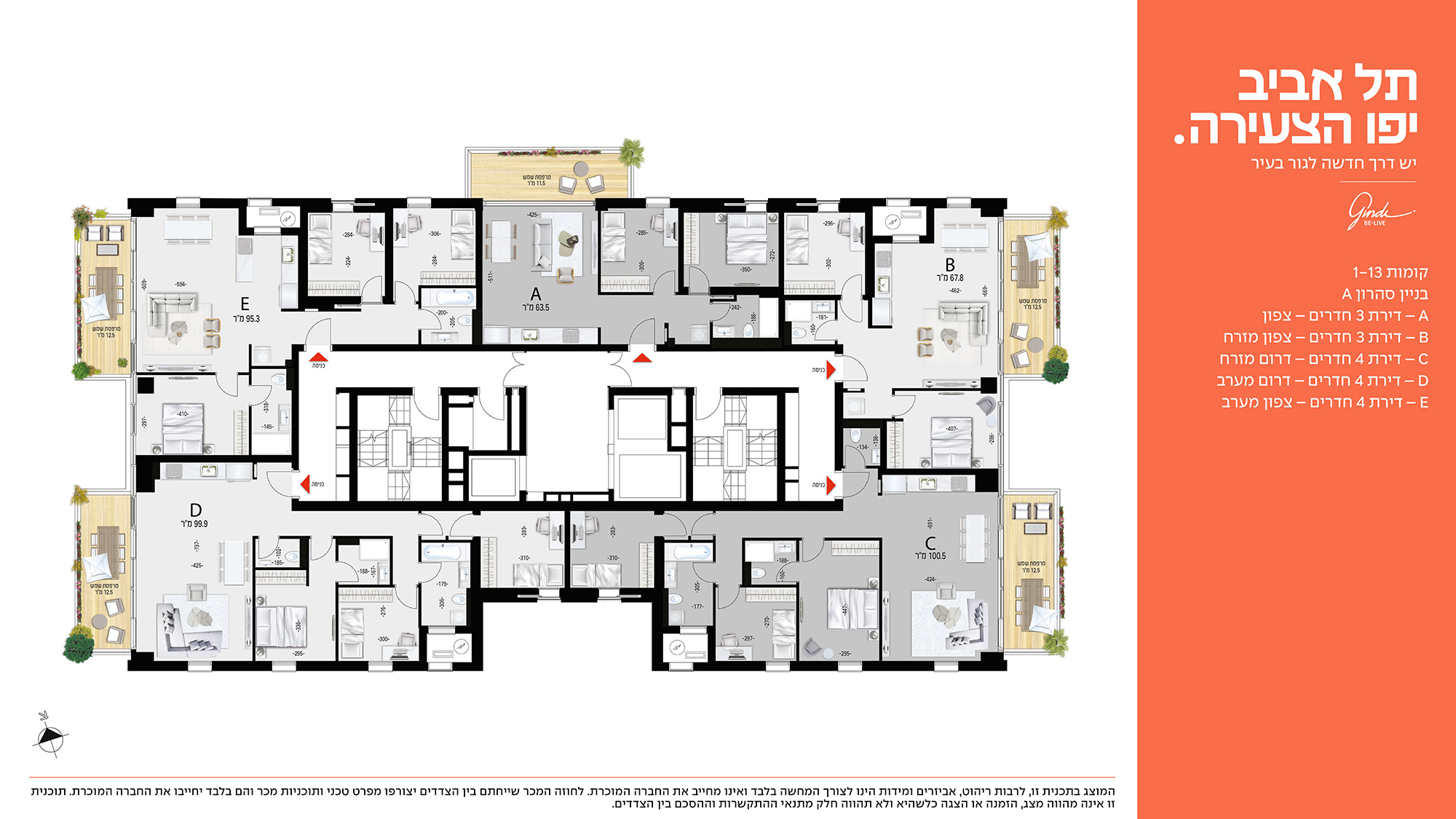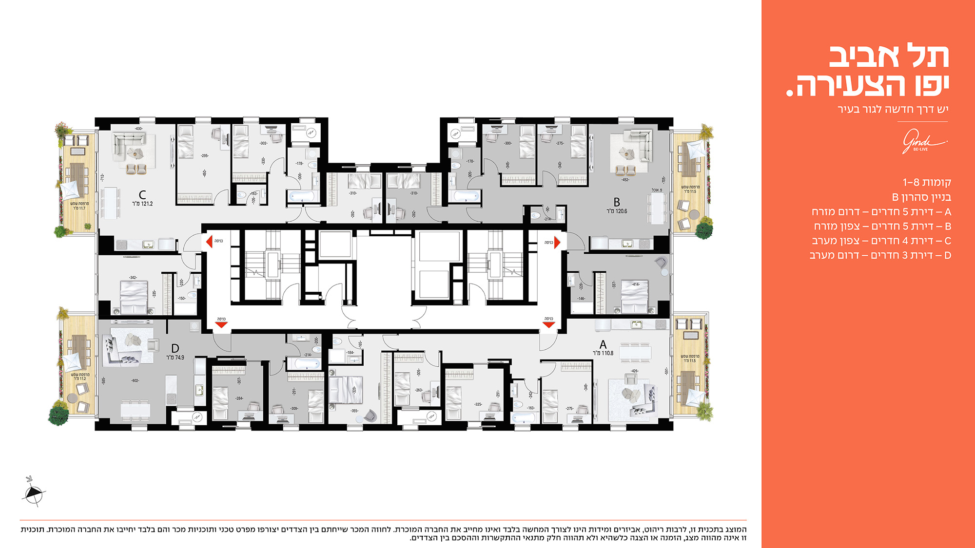 התכנים המובאים בחוברת זו הינם לצרכי שיווק בלבד ואינם מהווים הצעה מחייבת כלפי מאן דהוא. רק הסכם מכר חתום כדין בין החברה המוכרת לבין הקונה יחייב את החברה המוכרת. כל המידע והתמונות הכלולים בחוברת זו מיועדים להתרשמות ולצורכי מידע כללי בלבד, אין בהם משום התחייבות של גינדי בליב ו/או של החברה המוכרת, לרבות בקשר עם מפרטים ותוכניות, הדמיות, גדלים, מידות, וכל אלמנט אחר כלשהו. מבלי לגרוע מן האמור, תמונות, הדמיות, מידות, מימדים, ריהוט, מוצרי חשמל, אביזרי סטיילינג, ריצוף והתגמירים הינם לצורך התרשמות והמחשת הפוטנציאל בלבד, אינם מחייבים את גינדי בליב ו/או את החברה המוכרת ואינם כלולים בדירה הנמכרת. חוברת זו כולל הצעות עיצוב, שדרוגים וחומרי גלם אשר אינם מהווים חלק מהתכניות ו/או מהמפרט הטכני שיצורפו לחוזה המכר שייחתם בין החברה המוכרת לקונה. המפרט הטכני של הדירה והבניין הוא המפרט שייחתם בין החברה המוכרת לקונה.